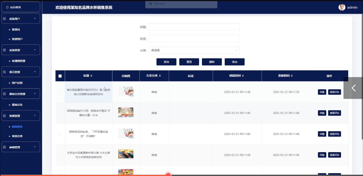 管理员在新闻资讯页面查看所有水杯资讯文章,支持新增、编辑和删除操作。点击“新增”填写标题、内容并上传图片,选择分类后发布。可批量删除过期文章。新闻资讯界面如图5-7所示。