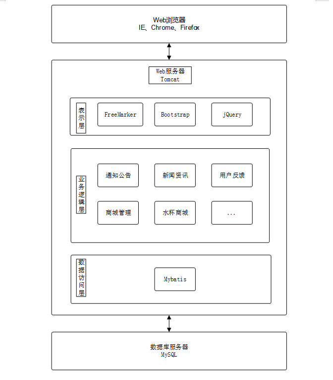 系统由表现层、业务逻辑层、数据访问层和数据库服务器组成。表现层通过浏览器(如IE、Chrome、Firefox)与用户交互,采用FreeMarker、Bootstrap、jQuery等技术实现界面呈现。业务逻辑层负责处理系统的核心业务逻辑,通过分模块设计实现功能分离。数据访问层使用MyBatis框架连接数据库,执行数据的增删改查操作。数据库服务器采用MySQL进行数据存储和管理,为系统提供稳定的数据库支持。整个架构通过Tomcat服务器完成用户请求的接收和处理,确保系统的高效运行[8]。整个系统架构如图4-1所示。