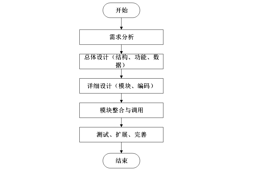 系统开发流程的主要步骤,从需求分析到系统完成的全过程。流程包括需求分析、总体设计(结构、功能、数据)、详细设计(模块、编码)、模块整合与调用,以及测试、扩展和完善,最终完成系统的开发。本系统的开发流程如图3-3所示