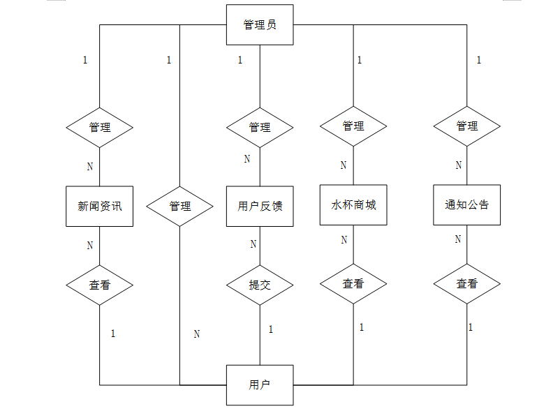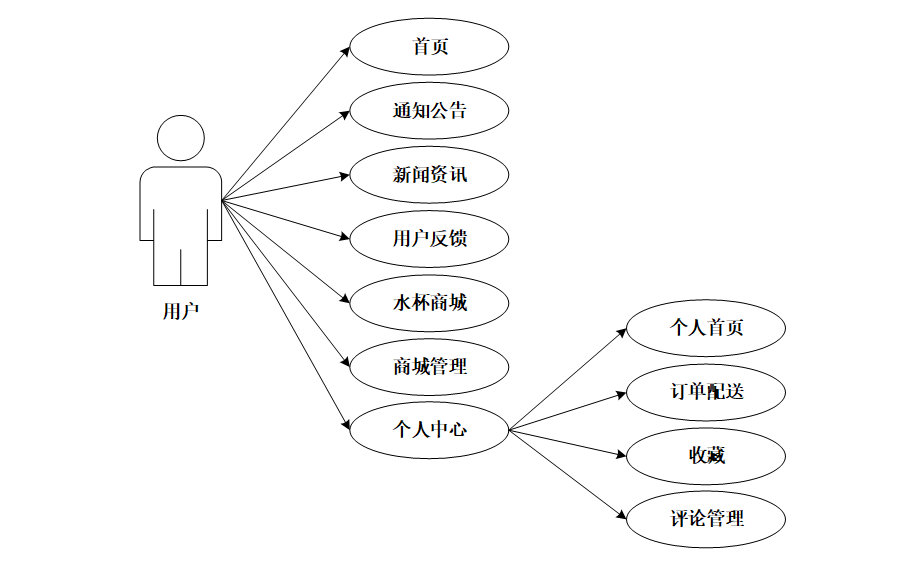 用户可查看首页、通知公告、新闻资讯、用户反馈、水杯商城、商城管理、个人中心(个人首页、订单配送、收藏、评论管理)。