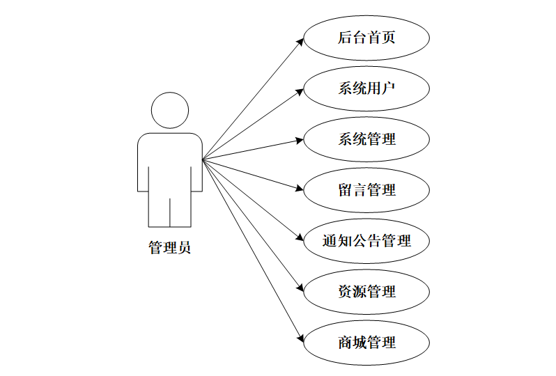 管理员可进行后台首页、系统用户、系统管理、留言管理、通知公告管理、资源管理、商城管理。