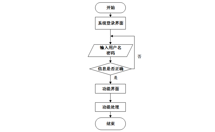 用户首先进入系统登录界面,输入用户名和密码后,系统验证信息是否正确。若验证失败,返回登录界面重新输入;若验证成功,则进入功能界面,执行相应功能处理后结束操作流程。操作流程如图3-5所示。