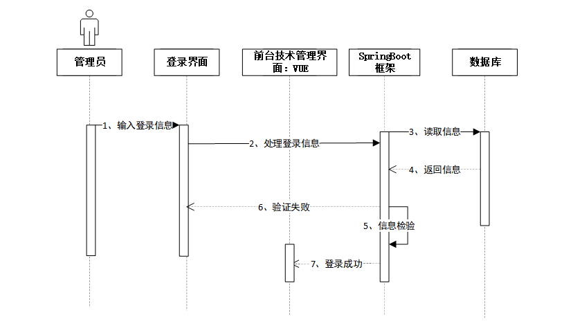管理员输入登录信息后,登录界面将信息传递至前台管理界面,随后通过SpringBoot框架读取数据库中的用户信息并返回。系统验证信息,若验证成功则登录成功,若验证失败则返回错误提示。登录时序图如图4-4所示。