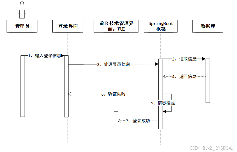 管理员输入登录信息后,登录界面将信息传递至前台管理界面,随后通过SpringBoot框架读取数据库中的用户信息并返回。系统验证信息,若验证成功则登录成功,若验证失败则返回错误提示。登录时序图如图4-4所示。