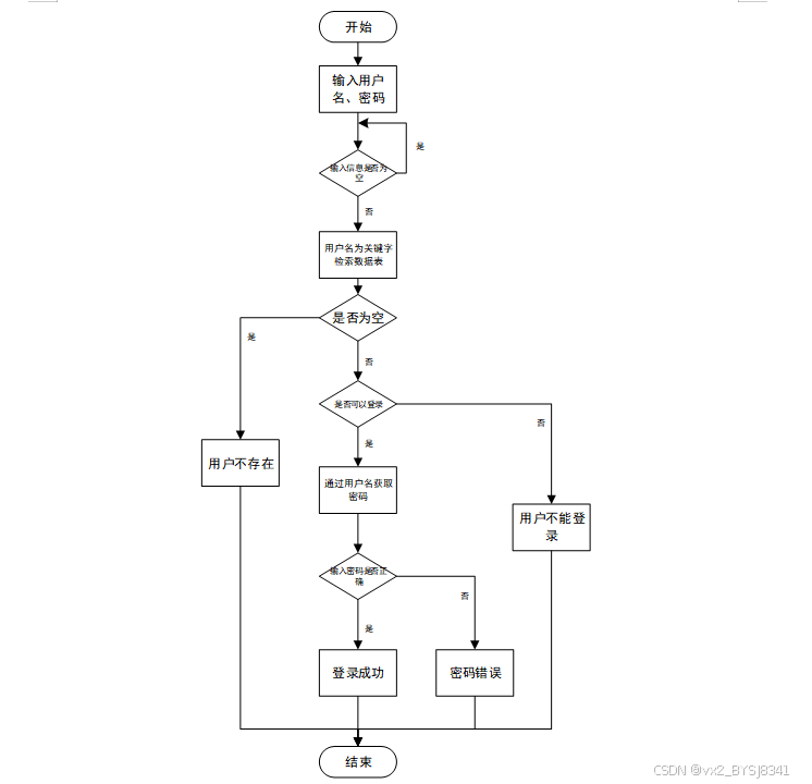 用户输入用户名和密码后,系统先检查输入是否为空,再验证用户名是否存在,若存在则通过用户名获取密码并校验。若密码正确则登录成功,否则提示密码错误。若用户名不存在或无法登录,提示用户操作无效。如图3-4所示。