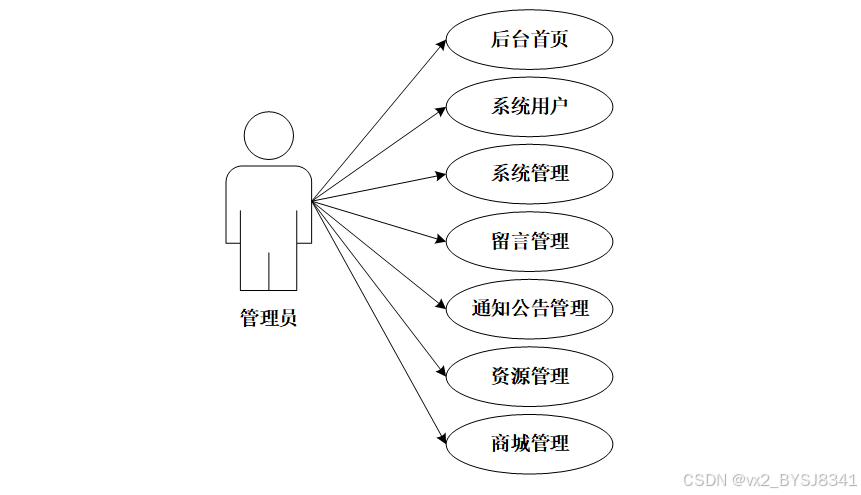 管理员可进行后台首页、系统用户、系统管理、留言管理、通知公告管理、资源管理、商城管理。