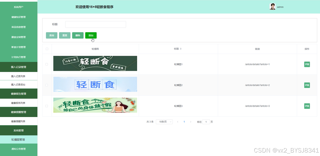 轮播图管理:管理员可设置平台首页的轮播图,进行内容的更新和维护。