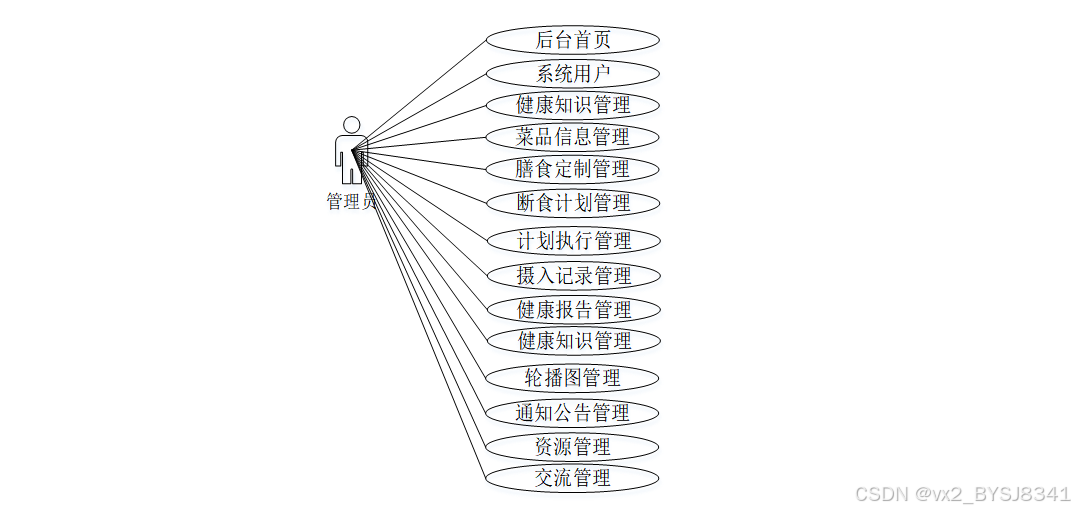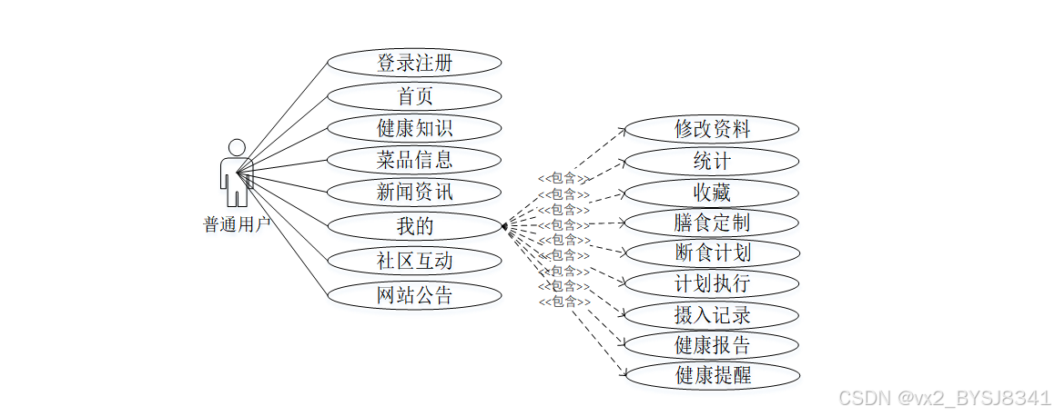 本系统主要面向普通用户和管理员,提供全面的健康管理功能。普通用户可通过微信小程序进行账号注册与登录,获取健康知识、浏览菜品信息、制定个性化膳食计划、管理断食计划、记录饮食摄入情况,并生成健康报告。此外,用户可在社区互动板块交流经验,并接收健康提醒。管理员则通过后台管理系统维护平台内容,包括健康知识、菜品信息、断食计划、用户数据及公告发布等。