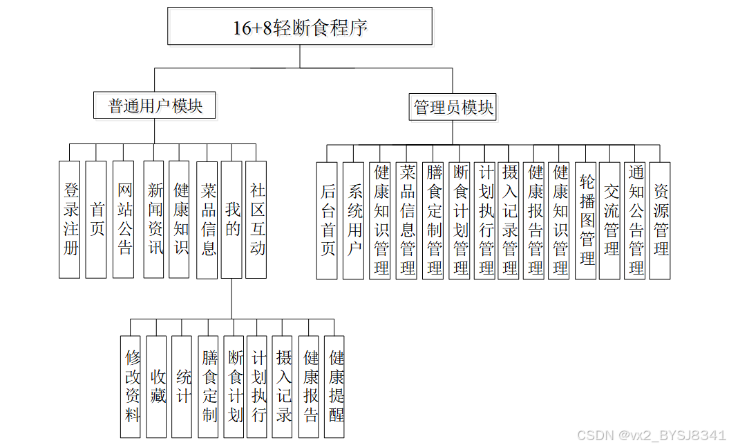 16+8轻断食程序的设计与实现可以从功能层面进行详细描述,涉及到普通用户和管理员两个角色的具体需求,基于Spring Boot、Java语言、MySQL数据库以及微信小程序的架构进行实现。下面详细阐述各个功能模块: