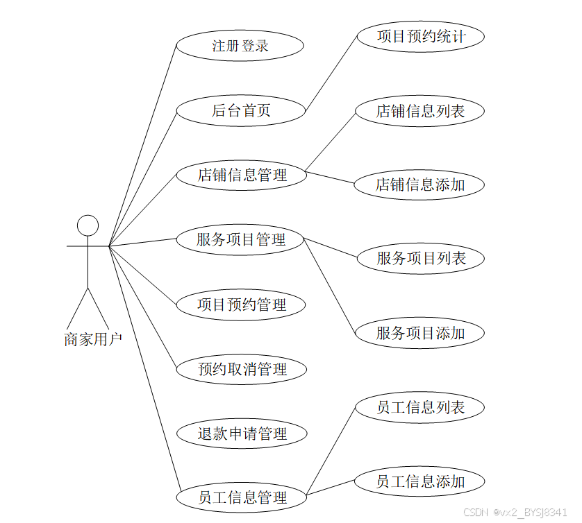 商家用户的主要功能包括商家用户可以通过注册登录平台,管理店铺信息、发布和编辑服务项目、处理用户预约、退款申请以及管理员工信息。主要功能包括: