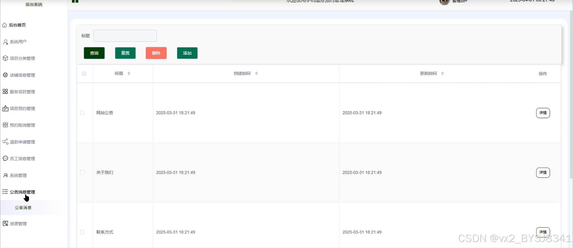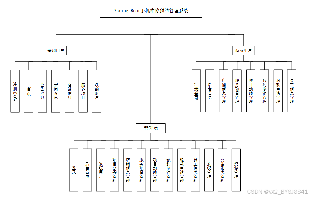 在基于Spring Boot框架的手机维修预约管理系统中,管理员主要包括登录、后台首页、系统用户、项目分类管理、店铺信息管理、服务项目管理、项目预约管理、预约取消管理、退款申请管理、员工信息管理、系统管理、公告消息管理、资源管理。
