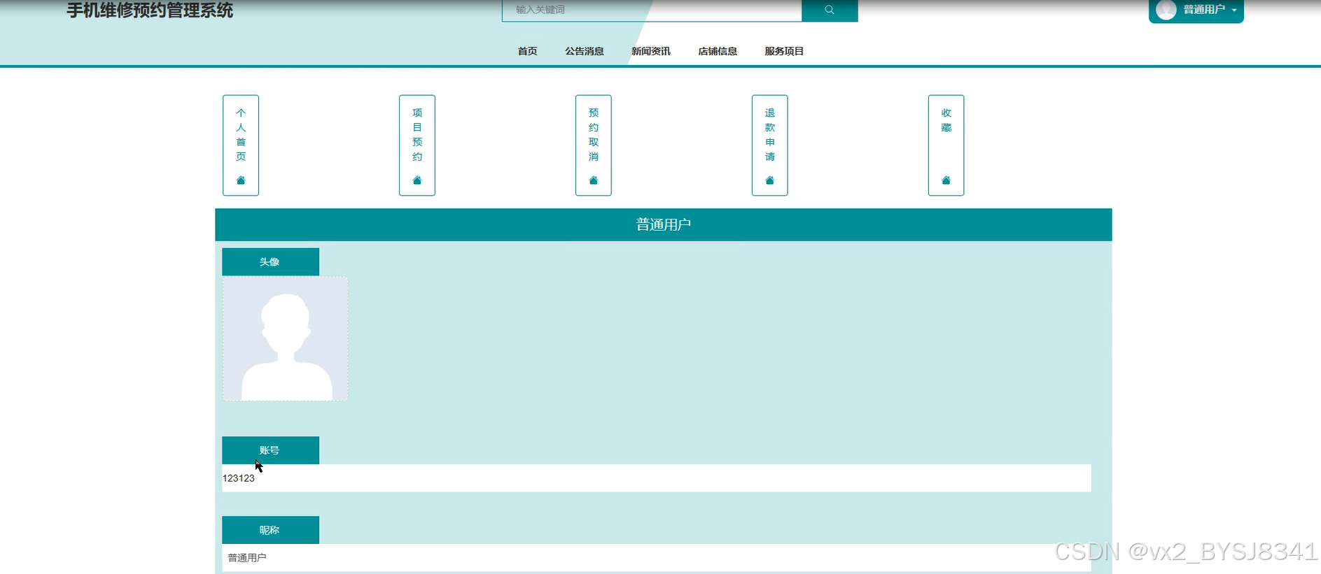 在基于Spring Boot框架的手机维修预约管理系统中,普通用户的主要功能包括注册登录、首页、公告消息、新闻资讯、店铺信息、服务项目、我的账户。