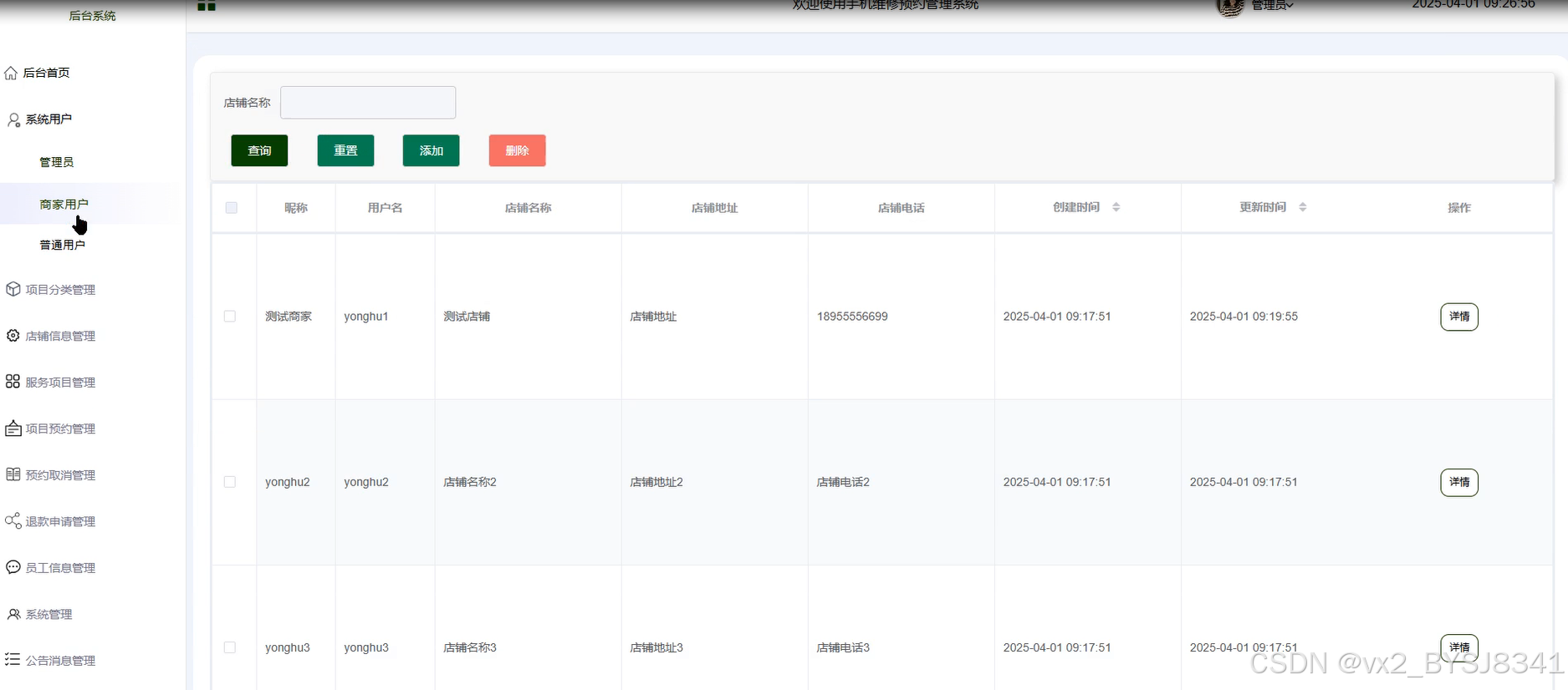 在基于Spring Boot框架的手机维修预约管理系统中,商家用户主要包括注册登录、后台首页、店铺信息管理、服务项目管理、项目预约管理、预约取消管理、退款申请管理、员工信息管理。
