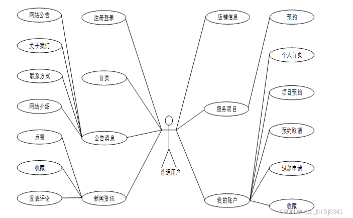 普通用户的主要功能包括注册登录平台,浏览服务项目、查看公告与新闻资讯,进行预约、支付、取消预约、申请退款及参与互动如点赞、收藏和评论等操作。主要功能包括: