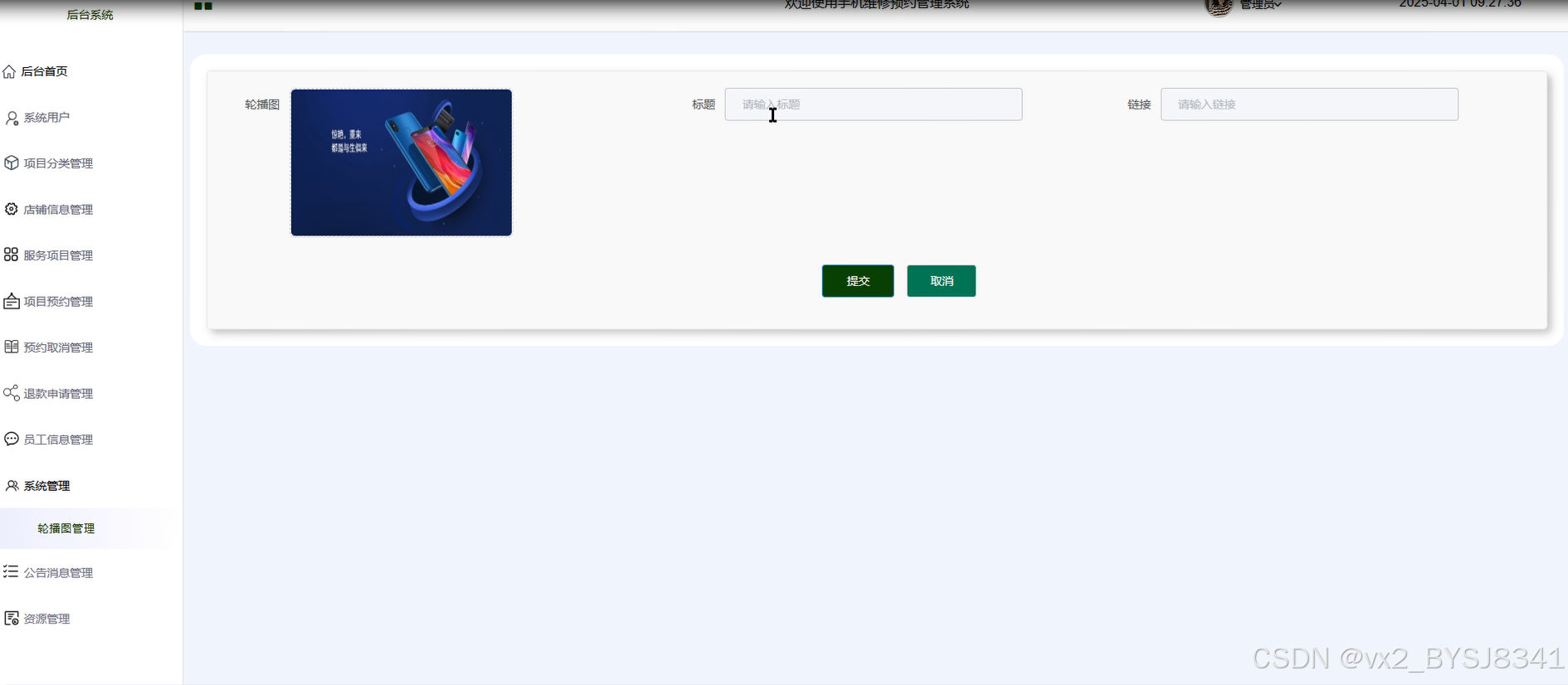 系统管理中的轮播图功能允许管理员添加、修改和删除平台首页的轮播图内容,用于展示重要信息、活动或宣传,提高平台的可视化效果和用户互动。系统管理界面如下图所示: