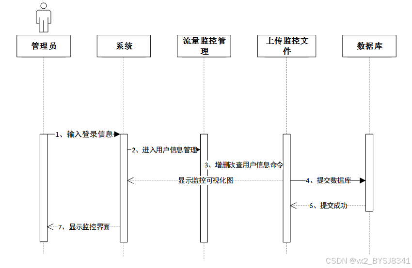 管理员输入登录信息后,进入流量监控管理模块,选择上传监控文件和增删改查操作并提交命令至数据库。数据库执行操作后返回成功状态,系统显示用户管理界面并提示操作成功。流量监控管理时序图如图4-5所示。
