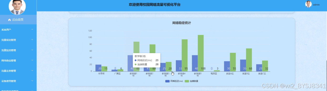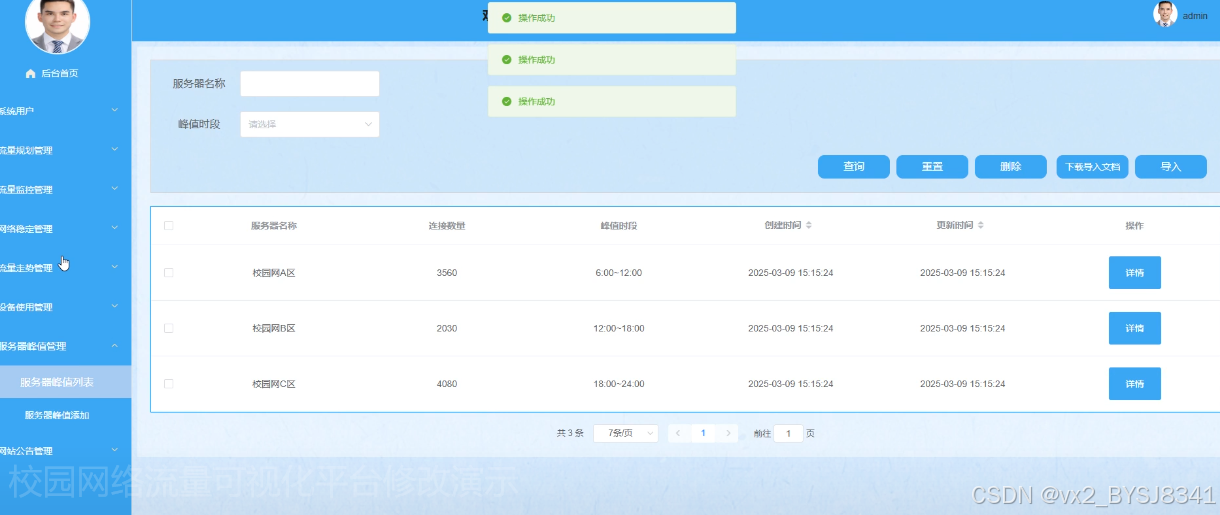 校园网络流量可视化平台的设计与实现针对当前高校网络管理中存在的效率低下、可视化不足等问题,提出了一套完整的解决方案。本研究基于SpringBoot+Vue技术栈,采用前后端分离架构,构建了包含流量规划、实时监控、网络稳定性分析等六大核心功能的系统平台。通过引入时序数据库存储高并发流量数据,运用ECharts实现动态可视化展示,并设计基于RBAC模型的权限管理系统,有效提升了校园网络管理的智能化水平。系统实现了设备使用统计、流量走势预测、服务器峰值预警等功能模块,通过多源异构数据融合技术解决了高并发场景下的数据处理难题,为网络运维人员提供了直观、高效的管理工具。
