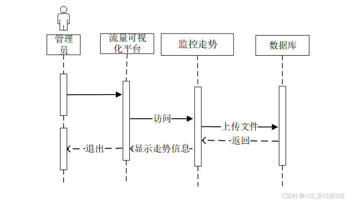 管理员通过访问系统发起请求,系统接收访问后转向监控走势操作。管理完成后,系统返回浏览走势数据至系统,最终反馈给管理员,管理员可选择退出。流量走势管理时序图如图4-6所示。