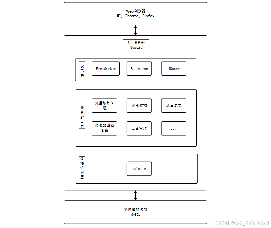 系统由表现层、业务逻辑层、数据访问层和数据库服务器组成。表现层通过浏览器(如IE、Chrome、Firefox)与用户交互,采用FreeMarker、Bootstrap、jQuery等技术实现界面呈现。业务逻辑层负责处理系统的核心业务逻辑,通过分模块设计实现功能分离。数据访问层使用MyBatis框架连接数据库,执行数据的增删改查操作。数据库服务器采用MySQL进行数据存储和管理,为系统提供稳定的数据库支持。整个架构通过Tomcat服务器完成用户请求的接收和处理,确保系统的高效运行[17]。整个系统架构如图4-1所示。