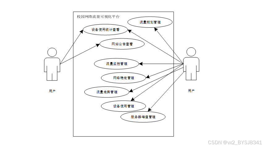 为明确校园网络流量可视化平台的功能边界和用户交互逻辑,本系统采用UML用例图进行需求建模。系统主要参与者包括普通用户和网络管理员两类角色,分别对应不同的功能权限和使用场景。普通用户通过Web界面访问设备使用统计和公告查询功能,管理员则具备完整的流量管理权限,包括流量规划配置、实时监控、网络稳定性分析等核心功能模块。系统用例设计遵循最小权限原则,通过角色权限分离确保数据安全性,同时各功能模块之间保持松耦合关系以提升系统可维护性。该用例模型为后续系统设计和开发提供了清晰的需求规范。系统用例图如图3-1所示。