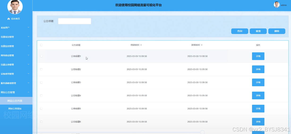 本系统基于Java技术栈开发,采用Vue作为前端框架实现用户交互界面,Spring Boot作为后端框架处理业务逻辑,MySQL作为数据库存储数据。系统实现了用户设备使用统计查看、网站公告查看等功能,管理员可通过系统进行流量规划、监控、网络稳定、流量走势、设备使用、服务器峰值管理以及网站公告管理等操作,包括查询、删除、导入、下载、统计查看等功能。通过引入自动化数据处理与可视化技术,解决了传统管理方式效率低、实时性差、难以精准预测等问题。