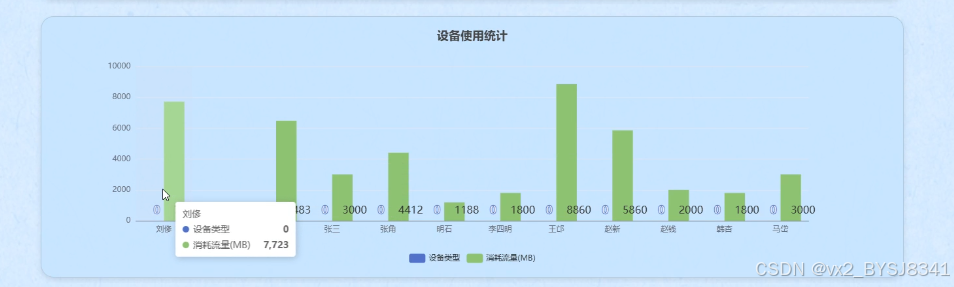 用户查看接入设备的在线时长与流量消耗统计,管理员可查询全部设备使用详情。系统支持按设备类型筛选,提供使用时长排名与流量消耗对比图表。数据支持Excel格式导入导出。设备使用统计界面如图5-4所示。