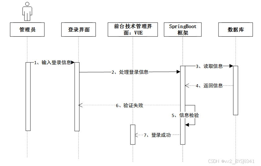管理员输入登录信息后,登录界面将信息传递至前台管理界面,随后通过SpringBoot框架读取数据库中的用户信息并返回。系统验证信息,若验证成功则登录成功,若验证失败则返回错误提示。登录时序图如图4-4所示。