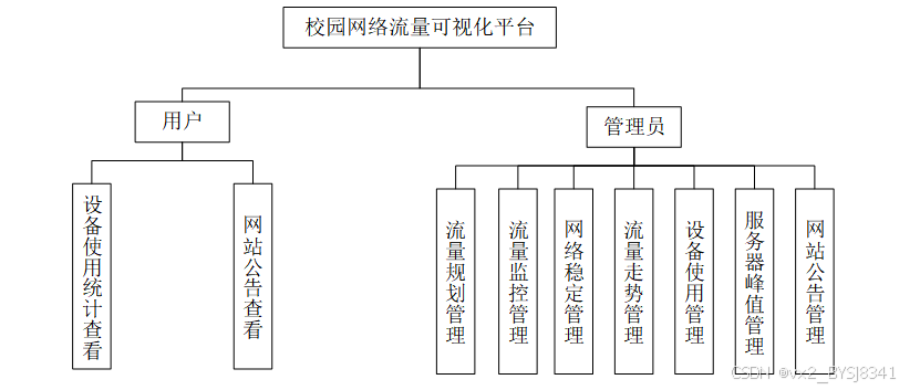 本系统实现校园网络流量的可视化监控与管理,主要功能包括:用户端提供设备使用统计和公告查询;管理员端具备流量规划、实时监控、网络诊断、趋势分析、设备管理和峰值预警六大核心功能,支持数据可视化展示、智能分析和批量导入导出操作,全面提升校园网络运维效率和管理水平。系统功能结构图如图4-2所示。