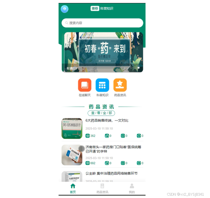 药品资讯:提供详细的药品信息,如药品名称、图片等,支持搜索、点赞、收藏、评论、回复和删除功能,便于获取最新药品资讯。