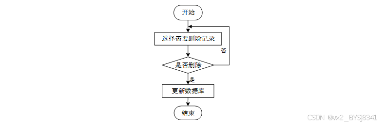 用户选择需要删除的记录后,系统判断是否确认删除。若未确认,返回选择环节,若确认删除,则更新数据库,删除对应记录,完成操作后流程结束。删除信息流程图如下图所示。