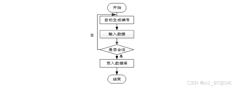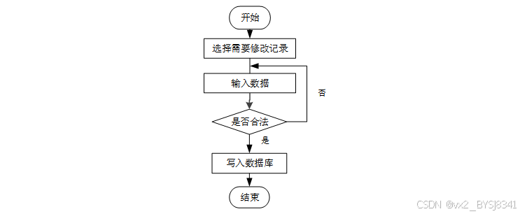 用户首先选择需要修改的记录,输入修改后的数据,系统判断输入数据是否合法。若数据不合法,提示重新输入,若数据合法,则将修改后的数据写入数据库,完成操作后流程结束。修改信息流程图如下图所示。