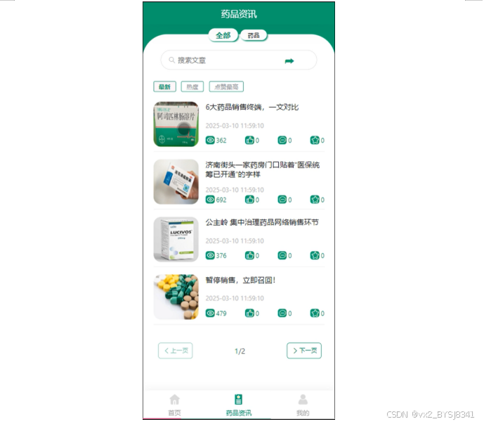 药品资讯:提供详细的药品信息,支持搜索、点赞、收藏、评论、回复和删除功能,便于了解最新的药品资讯。