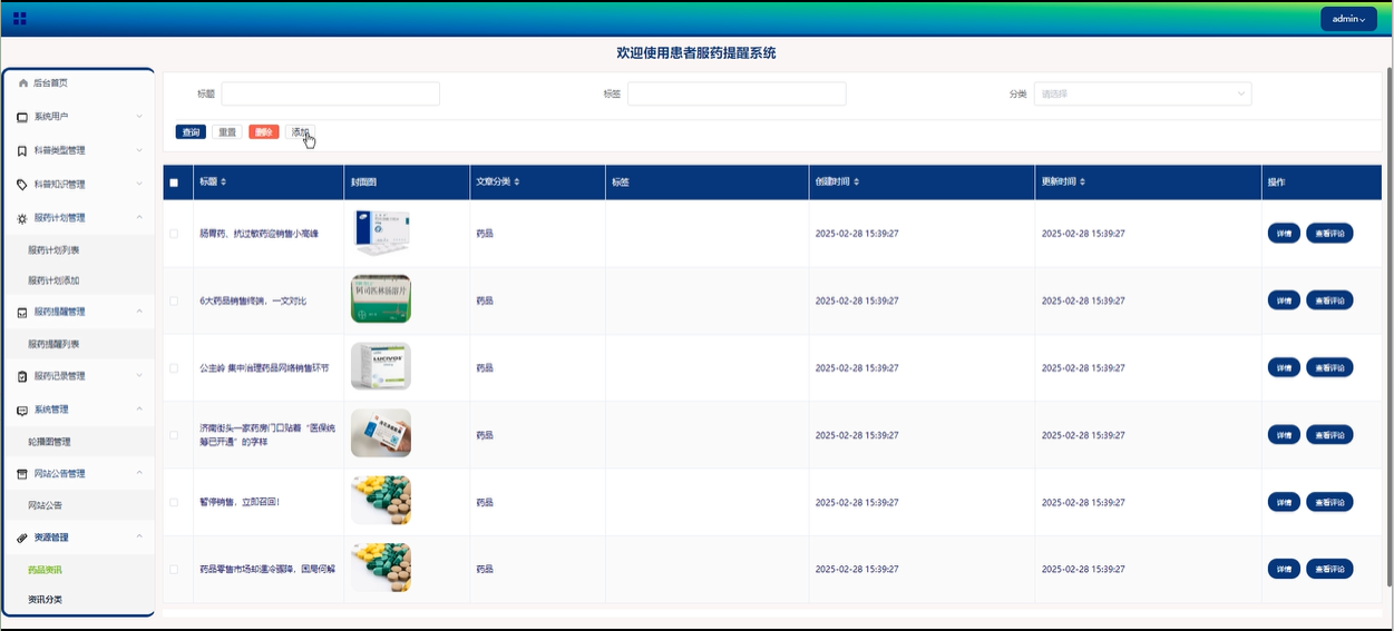 资源管理:管理员可以管理系统内的药品资讯和资讯分类,支持查看详情、用户评论、增删改查操作,确保信息的多样性和可访问性。