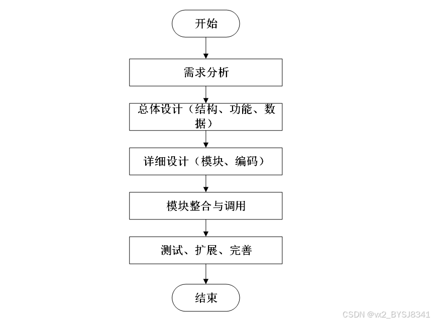 系统开发流程的主要步骤,从需求分析到系统完成的全过程。流程包括需求分析、总体设计(结构、功能、数据)、详细设计(模块、编码)、模块整合与调用,以及测试、扩展和完善,最终完成系统的开发。本系统的开发流程如下图所示