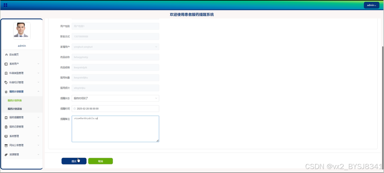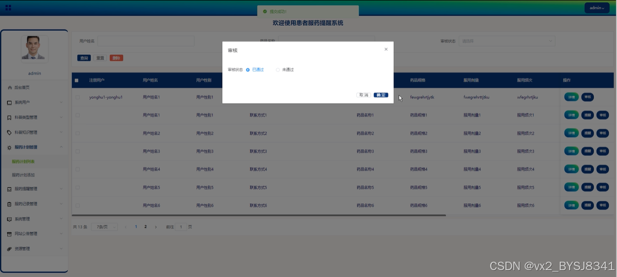 管理员可以查看用户提交的服药计划并进行提醒和审核管理,支持查询、重置和删除功能,以确保服药计划的合规性和及时性。如下图所示。