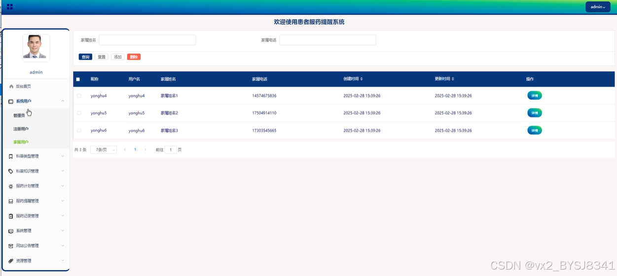服药提醒管理:管理员可以查看服药提醒详情和记录,支持查询、重置、删除和搜索操作,确保提醒功能的正常运行。