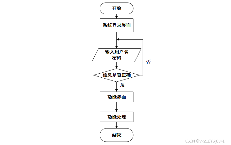 用户首先进入系统登录界面,输入用户名和密码后,系统验证信息是否正确。若验证失败,返回登录界面重新输入,若验证成功,则进入功能界面,执行相应功能处理后结束操作流程。操作流程如下图所示。