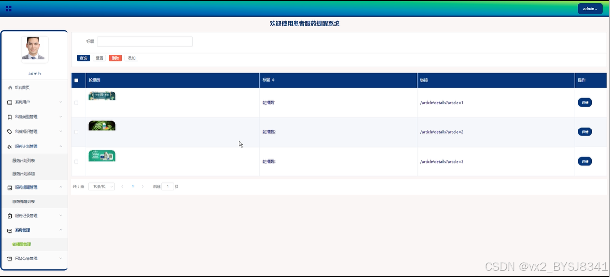 管理员可以对轮播图进行增、删、改、查操作,确保首页展示的内容时刻更新,吸引用户的注意。模块如下图所示。
