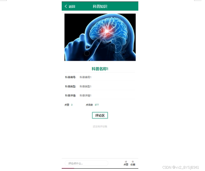 科普知识:用户可以查看科普知识详情,包括科普名称、类型等,并支持搜索、点赞、收藏和评论操作。