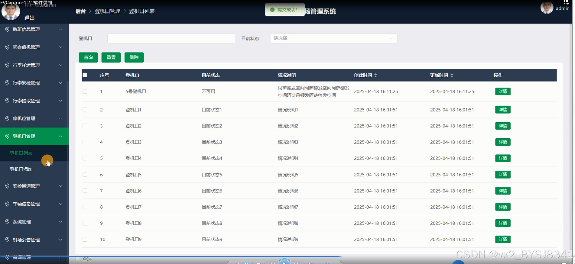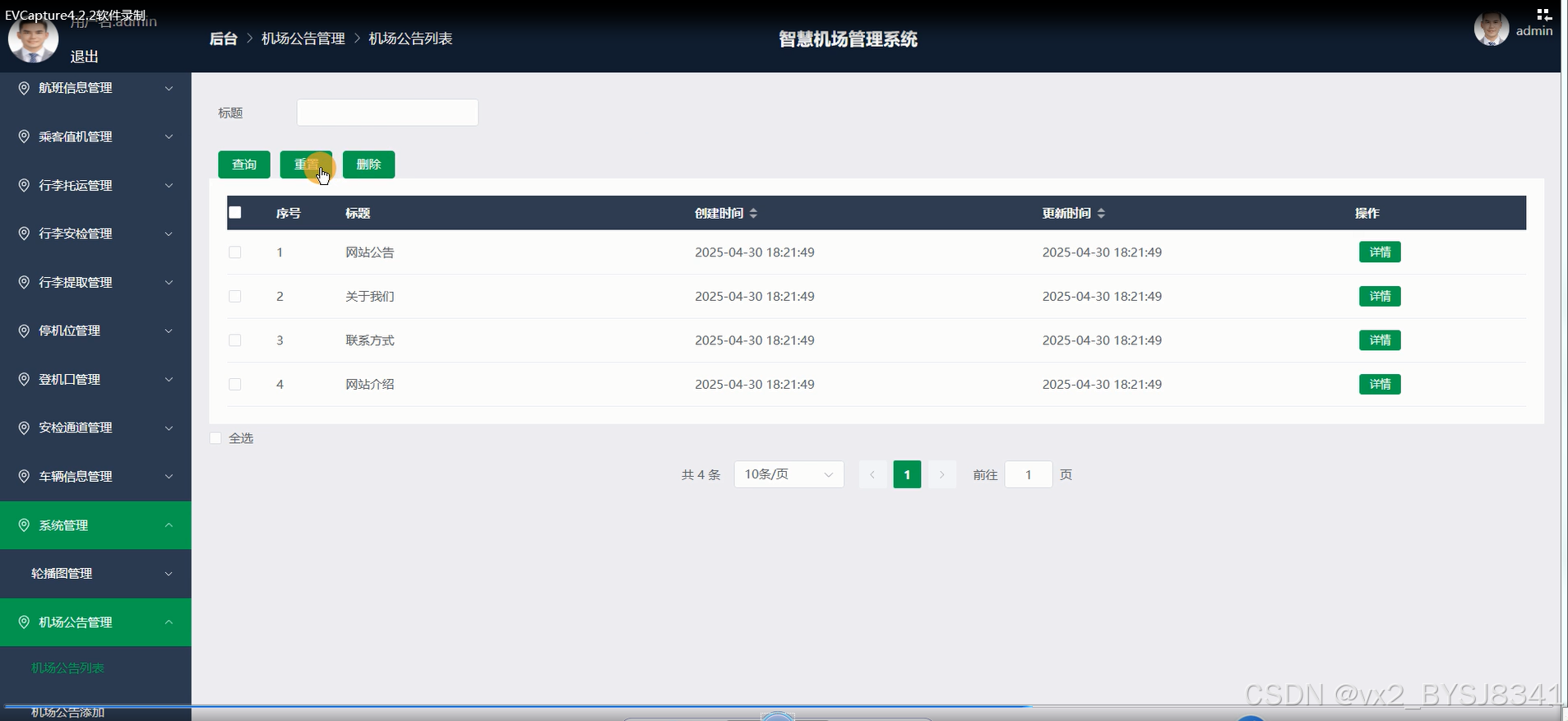管理员点击“机场公告管理”这个菜单,可以对系统中的机场公告进行管理,包括机场公告的增删改查等操作。机场公告管理界面如下图所示。