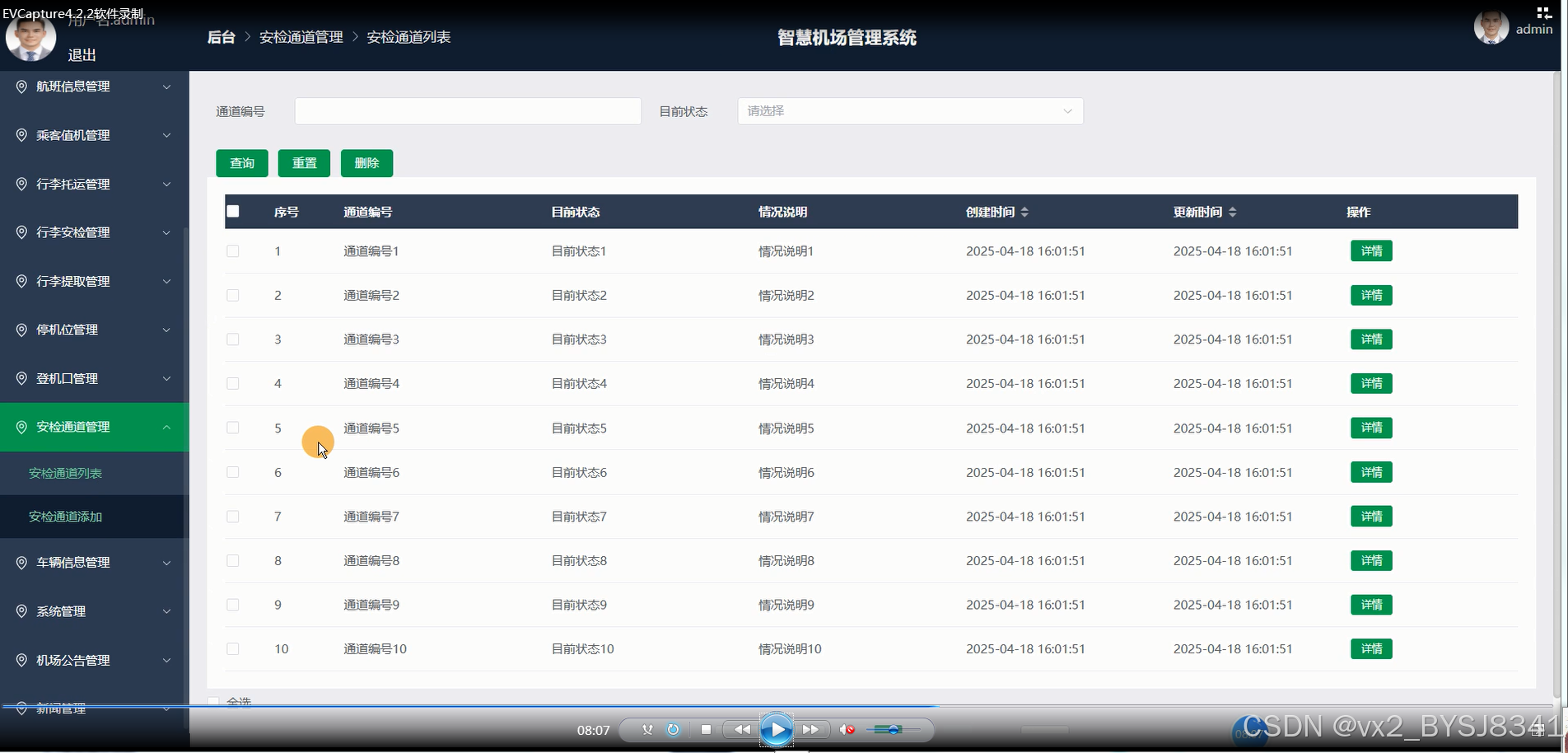 管理员点击“安检通道管理”这一菜单会显示安检通道列表和安检通道添加两个子菜单,点击“安检通道列表”可以查看安检通道详情,可以进行查询、重置、删除等操作。点击“安检通道添加”,管理员可以添加新的安检通道。安检通道管理界面如下图所示。