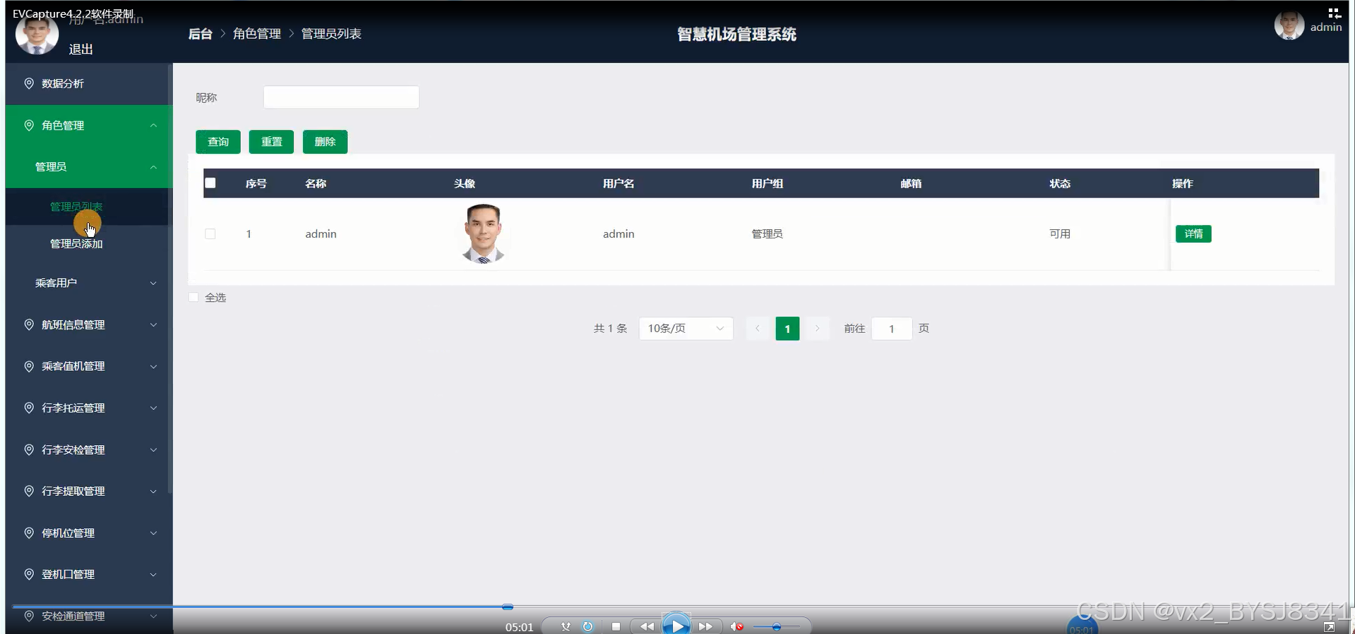在“角色管理”模块下,管理员可以管理系统上的两类用户:管理员和乘客用户。管理员可以进行用户的增、删、改、查操作,包括设置权限、修改用户信息等。角色管理界面如下图所示。