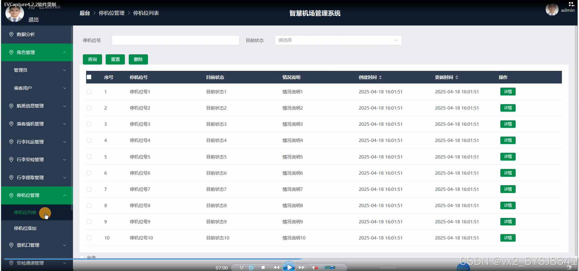 管理员点击“停机位管理”这一菜单会显示停机位列表和停机位添加两个子菜单,点击“停机位列表”可以查看停机位详情,可以进行查询、重置、删除等操作。点击“停机位添加”,管理员可以添加新的停机位。停机位管理界面如下图所示。