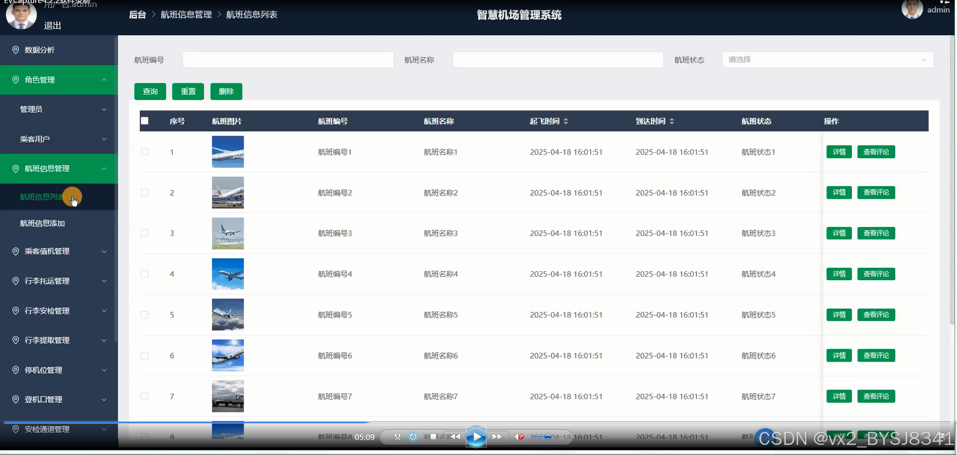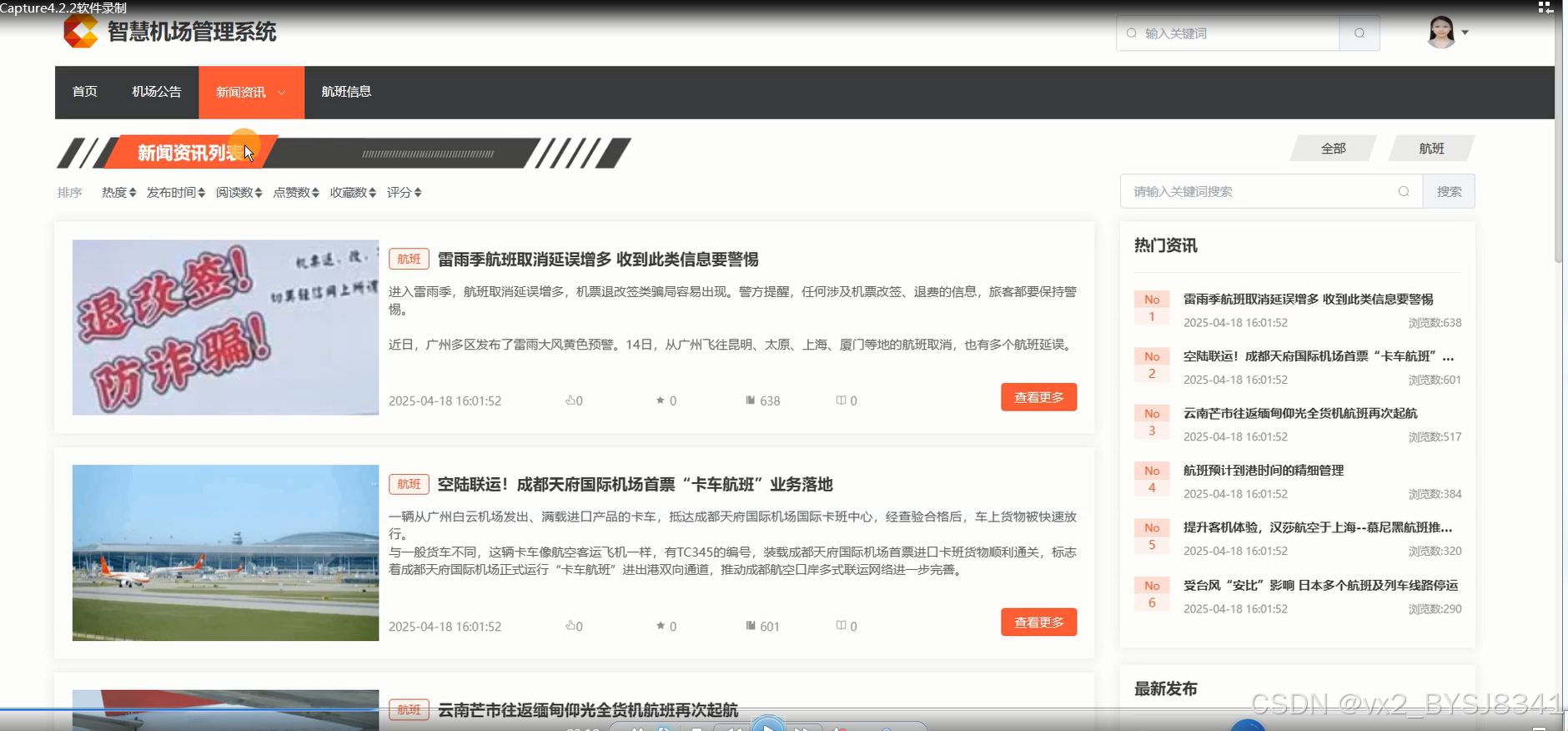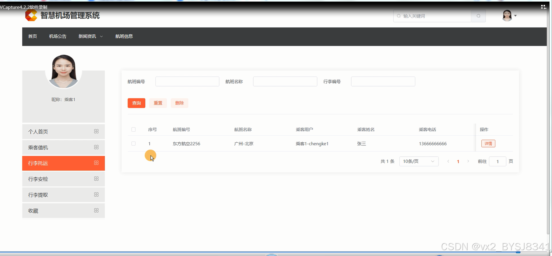 The smart airport management system is an important component of modern airport operations, aimed at improving airport management efficiency, optimizing passenger service experience, and strengthening security through information technology. The system is developed based on the SpringBoot framework, fully utilizing its concise and efficient features to build a highly scalable and easy to maintain system architecture. The core functions of the system include flight information management, passenger check-in management, baggage check-in and security check, parking and boarding gate management, airport announcements and news releases, and multiple other modules. Administrators can achieve real-time monitoring and scheduling of various airport resources through this system, ensuring smooth and efficient airport operations. Passengers can obtain real-time flight information, check in, and check in their luggage through this platform, which enhances the convenience and safety of their travel.