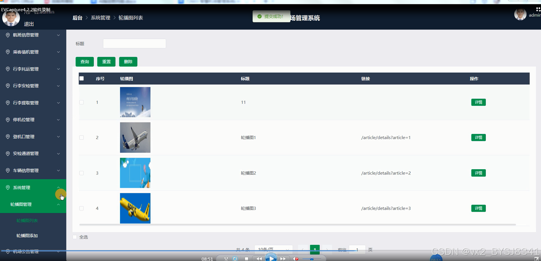 管理员点击“系统管理-轮播图管理”菜单,可以对前台展示的轮播图进行设置,系统管理界面如下图所示。