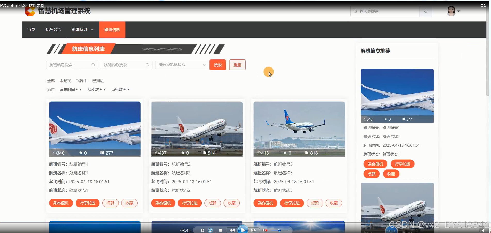 用户进入航班信息页面,浏览航班信息的图片、名称、描述等基本信息。通过搜索栏输入关键词或筛选条件,快速定位航班信息界面。可以进行乘客值机、行李托运、点赞和收藏。航班信息界面如下图所示。