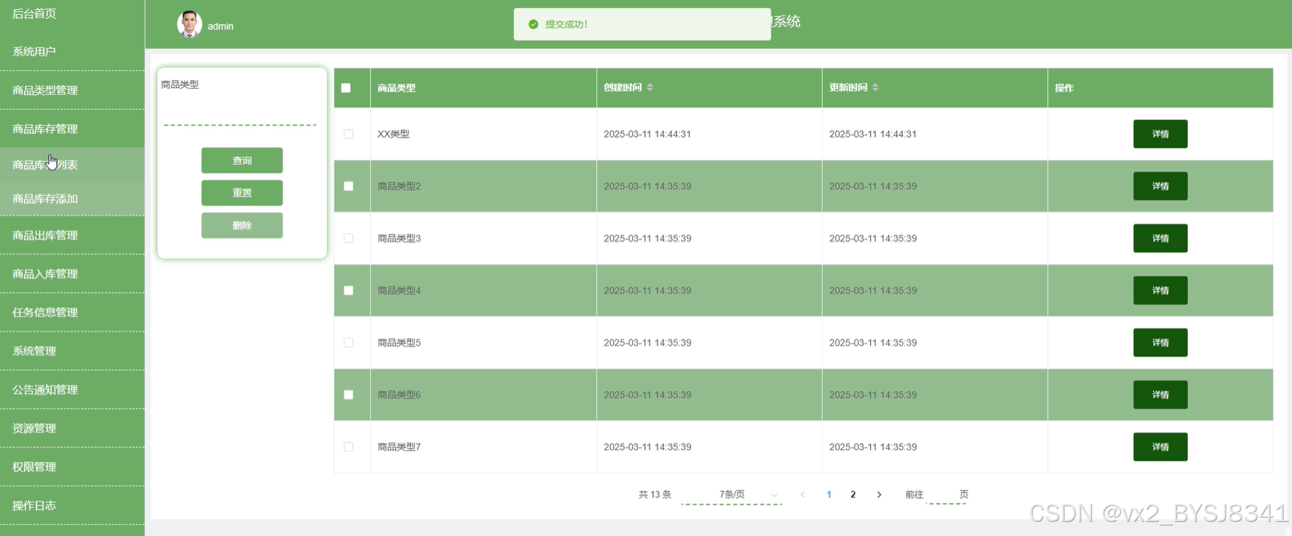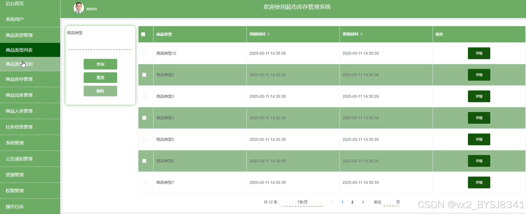 (6)商品入库管理:管理人员可查看商品入库详情,可进行查询、重置、删除等操作。