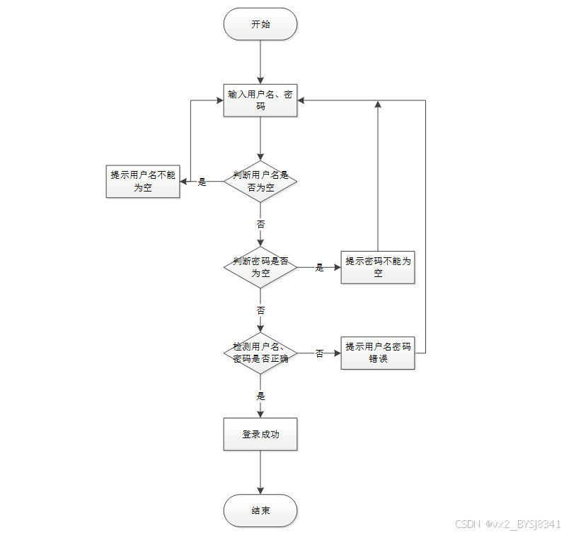 所有用户登录系统需要前端校验用户名、密码是否正确以及是否为空,具体流程图如图所示: