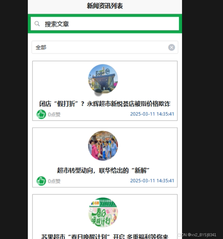 新闻资讯:展示后台发布的新闻资讯信息,可局部搜索,可点击信息可发表评论以及回复评论或者对新闻资讯信息点赞、收藏等操作。新闻资讯如图5-3所示