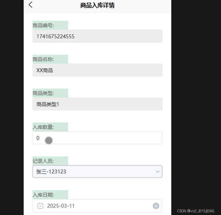 个人中心:包含商品库存、商品出库、商品入库、任务信息等的功能,商品库存:员工用户点击“个人中心”,进入商品库存页面,点击商品信息,就可以记录商品的名称、数量、类型、存放于某个具体位置信息。可进行查询、重置、添加等操作。商品出库:员工用户点击“个人中心”,进入商品出库页面,有商品从仓库中取出时,员工可以在此功能进行一个商品出库处理。员工进行了商品出库处理后,系统会自动对商品库存进行相应的调整。可进行查询、重置、添加等操作。商品入库:员工用户点击“个人中心”,进入商品出库页面,有商品放入仓库时,商家或者员工可以在此功能进行一个商品入库处理。商家或者员工进行了商品入库处理后,系统会自动对商品库存进行相应的调整。可进行查询、重置、添加等操作。任务信息:员工用户可查看后台管理员发布的任务信息详情状态。可进行查询、重置等操作。商品库存如图5-4所示、商品入库如图5-5所示